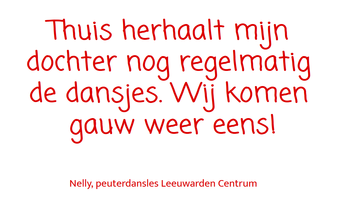 Danswil geeft danslessen en dansworkshops. Dansjuf Willy van Assen geeft met veel plezier les in het onderwijs én aan particulieren. Er zijn op dit moment alleen lessen voor peuters in Leeuwarden. Je kunt kiezen voor een lessenserie of voor losse lessen. Voor het onderwijs biedt Danswil Taal- en Rekendans, Dans als Middel, Dans op Maat en Dûnsje mei Tomke aan. Kijk wat Danswil voor jou kan betekenen!
