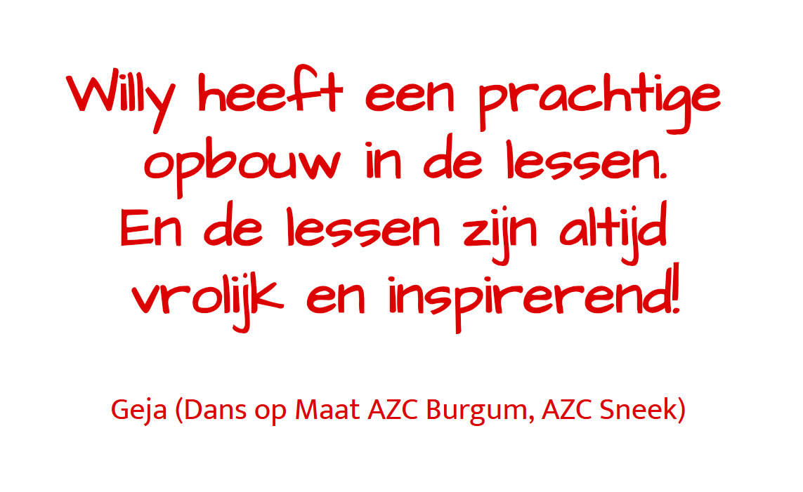 Ik, Willy van Assen, dans vanaf mijn 5de. Het plezier dat ik beleef aan dansen wil ik graag doorgeven. Na mijn lerarenopleiding (basisonderwijs) heb ik de opleiding Dansexpressie in Amsterdam gevolgd. Ik heb zeven jaar met veel plezier, voor de klas gestaan. Naast mijn baan in het onderwijs had ik mijn eigen dansbedrijf als dansjuf. Sinds september 2018 richt ik mij alleen nog maar op dit bedrijf, Danswil. Ik geef nog wel veel dansles in het onderwijs. Op mijn manier probeer ik het onderwijs in beweging te krijgen. Dat is ook één van de redenen waarom ik de opleiding Taal- en Rekendans heb gevolgd. Ik geef dansles op basisscholen, AZC’s en peuterscholen. Daarnaast werk ik voor theater en mienskipsprojecten waar ik dans voor maak.